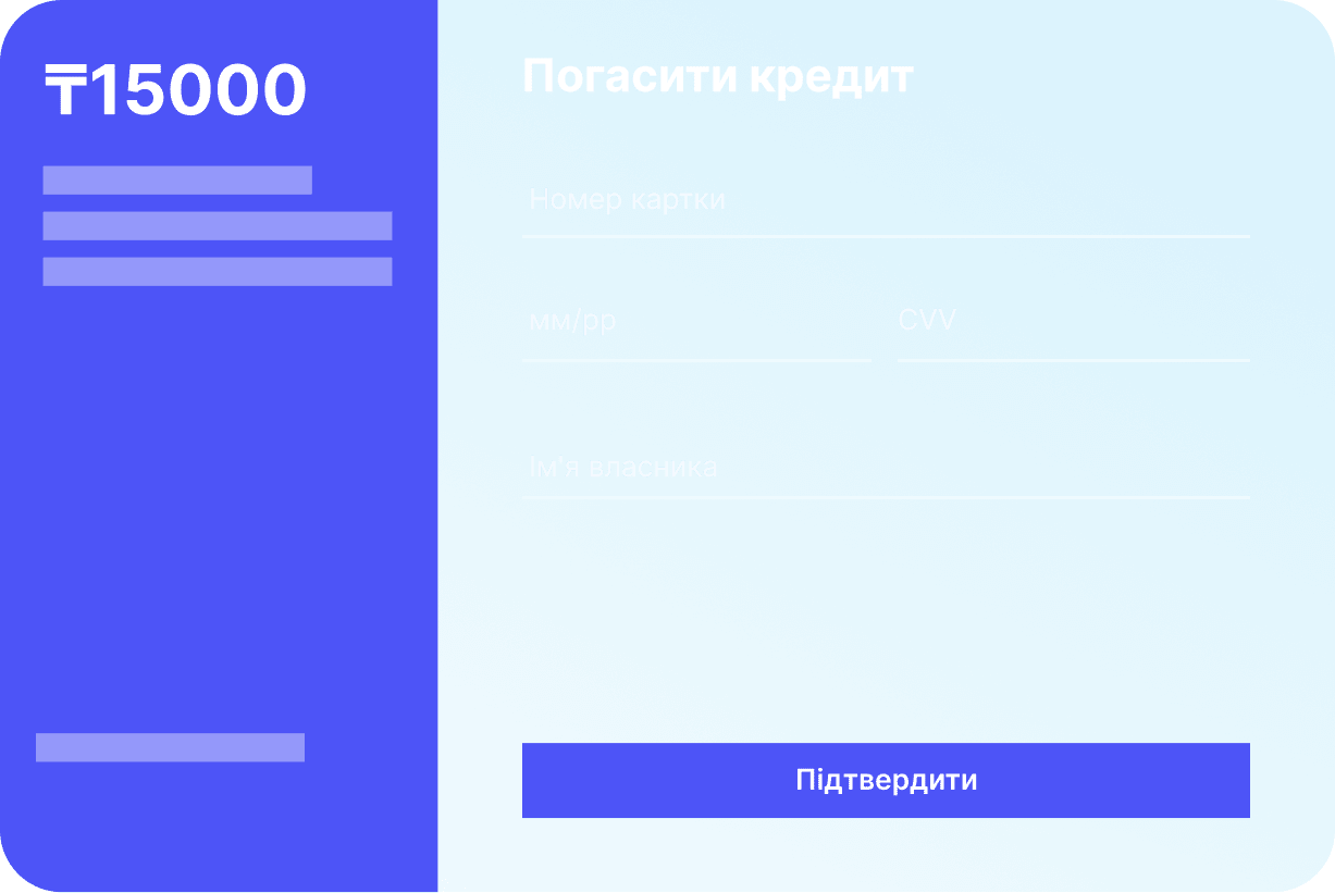 Використовуючи наш сервіс ви зможете видавати кредитні гроші, надавати можливість погашення кредитів, використовуючи наше "Каскадне" рішення, де ви можете кастомізувати сторінку під ваш дизайн і додати своє лого.